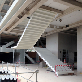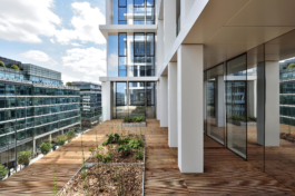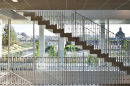 Ce rythme d’espaces et de volumes mêlé aux au jeu de modénatures confèrent à l’ensemble un effet de légèreté, parallèlement il constitue pour les utilisateurs un lieu de travail ponctué des surprises et de points de repères. Un autre rapport entre l’homme et son lieu de travail s’opère, le collaborateur y retrouve le confort naturel de l’échelle humaine, de la dimension humaine. Le projet s’organise autour d’un hall traversant dans lequel se déploie librement un escalier monumental jusqu’au dernier étage. La transparence du hall et de l’escalier, dessiné par l’agence, offre des vues depuis la rue sur le jardin et l’Hôpital Salpêtrière sur toute la hauteur de ce compartiment vertical.
