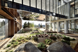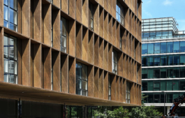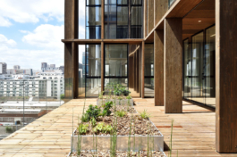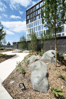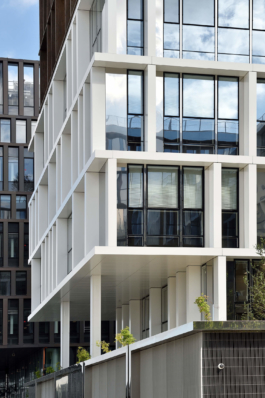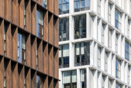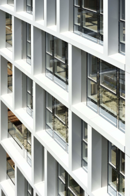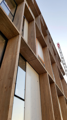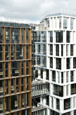 Le programme très contraint a nécessité une recherche perpétuelle de légèreté ; autour d’un « jardin-forêt », le corps principal formé en U se scinde en deux parties, l’une est traité en bois sombre (lamellé collé pré-vieilli) et l’autre est traitée en aluminium blanc (peinture poudrée à effet minéral). Des jeux de volumes en retraits ou surplombs d’espaces protégés ou exposés dégagent terrasses, balcons, de même que des passerelles sont lancées au travers d’une faille sur plusieurs niveaux permettant simultanément de joindre et de libérer chaque compartiment. Toujours à la recherche d’effets optiques, la première peau menuisée est travaillée comme un miroir pour doubler la perception de la profondeur des épines. Depuis l’intérieur des bureaux, ces modénatures donnent un caractère chaleureux et protecteur.