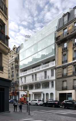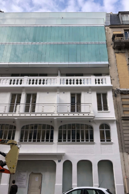La conservation de la façade existante sur rue semble évidente, remarquable de style emprunté à l’Art Nouveau, les châssis sont remplacés par des menuiseries en acier afin de conserver la finesse des profilés d’antan, les enduits décapés et la brique simplement repeinte d’un blanc éclatant de jouvence. La partie en surélévation, nouvelle, doit disparaitre et rendre hommage à son écrin en réfléchissant tour à tour, le ciel et les façades en vis-à-vis de la rue Championnet, cet effet est rendu possible par un jeu de ventelles orientables, à la fois protectrices et respectueuses. Ce projet est un bel exercice de réinterprétation et d’émulation entre l’histoire et le contemporain à venir, la rencontre de deux temps sans anachronismes, un mariage tout en sobriété.