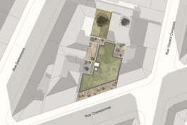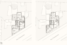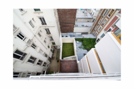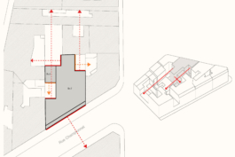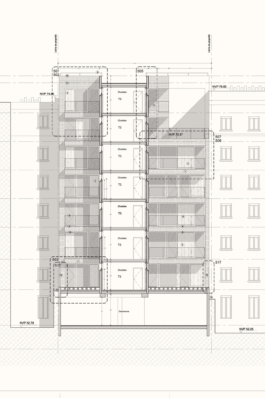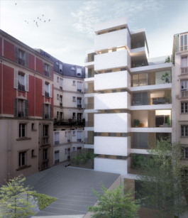 Notre première attention s’est portée sur la façon d’utiliser judicieusement l’ensemble des contraintes pour qu’elles se muent au service du projet. A chaque courette mitoyenne, nous y adossons une courette, créant ainsi une cour de bonne taille par effet de cour commune. A chaque pignon ou mur aveugle nous venons nous y accrocher, nous rentrons délicatement dans le gabarit des héberges avoisinantes, cherchant à réduire au maximum l’impact de notre intervention. Ces alternances de pleins et de vides sont calibrées en hauteur pour ménager des vues principales uniquement en façades sud et secondaires en façades nord. Ce travail de « tailleur » par retraits successif au plein rend chaque logement pleinement traversant voir même multi-traversants pour certains logements s’enroulant sur plusieurs cours successives. L’élégance de notre réponse se retrouve sur le traitement de l’implantation en fond de parcelle, le PLU permettant des ouvertures en limites par principe de jour de souffrance, nous avons travaillé cette façade en bandeaux, plus qu’une astuce ou un simple traitement, il s’agit là d’une véritable façade qui est donnée à voir aux riverains donnant sur la cour partagée par l’ensemble des copropriétés. Ces bandeaux vitrés gênèrent l’ensemble des façades sur cour, les épaisseurs de bandeaux vitrés se retrouvent sur les épaisseurs de balcons et autres épaisseurs de voiles.