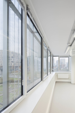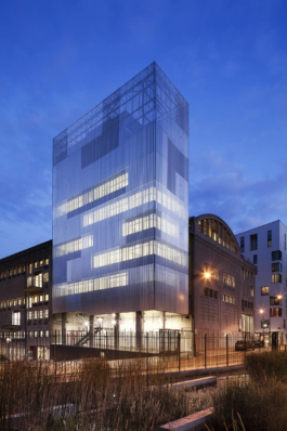 The only elements to cut through this break are three walkways that delicately connect the Voltaire Building to the Halle aux Farines. The Halle is completed by this lighthouse or control tower-style building for the Paris Diderot University. In order to reveal the full diaphanous glory of this extension, the Voltaire Building is clad in folder, perforated anodised aluminium. A single curve distorts the now-imperfect, oblong and feminine parallelepiped, allowing the aluminium to play with the light. The Voltaire Building remains a discreet observer during the day, while nightfall reveals its activity like an urban candlestick.
