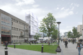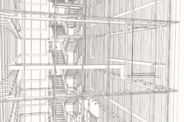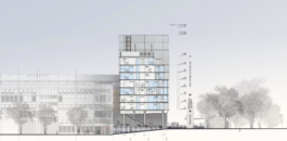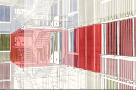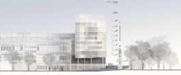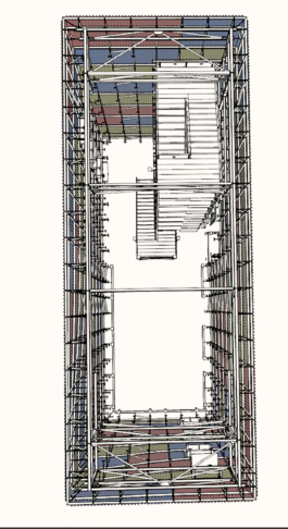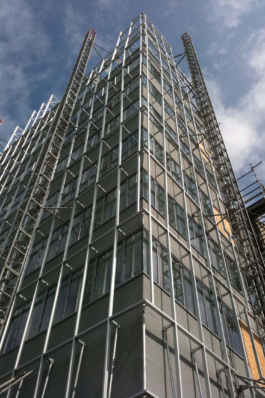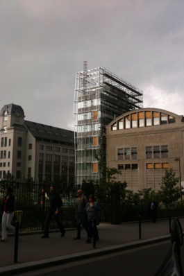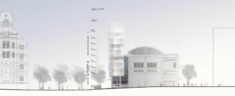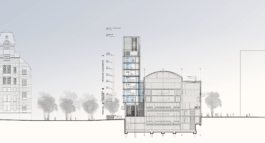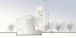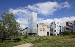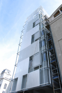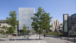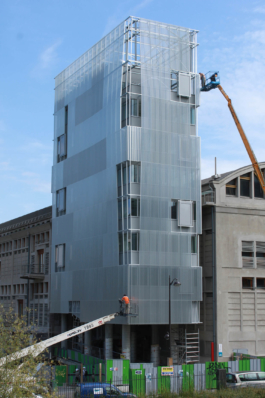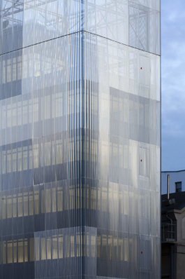 . In 2008, the university began its second extension phase, completing the urban campus and finalising its relocation. Out of the various buildings to be redesigned, our practice was entrusted with designing a micro-tower to house the university’s new community and cultural spaces. The unique site is beautiful and restrictive in equal measure: a 160 m² (8 m x 20 m) notch cutting through the south-west corner of the Halle aux Farines, something that dates back to the original construction.