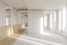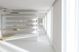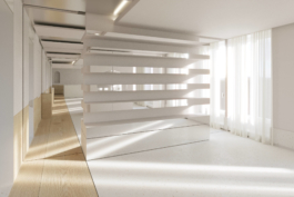L’autre moitié des appartements sont privés, ils sont inaccessibles et n’existent pas pour le visiteur. Dérobés de la vue de tous, on y accède par des passages à la fois monumentaux et invisibles, lieux secrets de passage d’un état à l’autre, du public à l’intime, ils donnent accès à l’autre coté du miroir, ce sont de véritables sas vers l’espace quasi-reptilien de Madame M. L’espace public sur rue et l’espace privé sur cour sont couchés l’un contre l’autre, se reflètent l’un dans le volume de l’autre, bien qu’ayant des vies parallèles, ils se mélangent et se fondent dans leurs perspectives et points de fuite, cette rencontre est une expérience unique d’ubiquité.