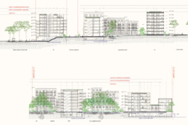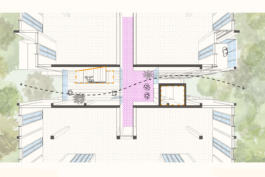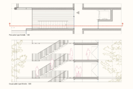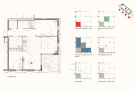 Nous proposons pour chaque bâtiment un long hall traversant en façade sur le talus arboré, connectant la RD et une venelle haute qui structurera le reste du quartier développé en partie haute du talus. Leur volumétrie est marquée par la recherche d’un palier central éclairé et traversant qui occasionne une faille allégeant et scindant la perception du bâtiment dans la pente. Des escaliers s’y développent à l’air libre. Le plan des bâtiments respecte une trame en plan de 3m, qui s’exprime de la même façon en façade et guide le dessin de pièces ‘modulaires’. Cette trame ponctuée de quelques poteaux, assure simplicité constructive et évolutivité, des pièces extérieures généreuses (balcons ou loggias), à la trame de 3m, créent des creux ou des avancées. Ces lieux extérieurs sont de véritables pièces supplémentaires à laquelle est toujours associée la cuisine, véritable lieu du mode de vie à la française. Les loggias au sud et à l’ouest assurent protection solaire, multi-orientation des logements, ainsi que la ventilation naturelle. Les balcons constituent des tourelles dans les arbres du talus et permettent aux logements aux orientations moins favorables d’aller chercher vues et lumière.