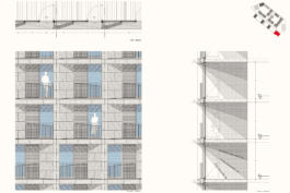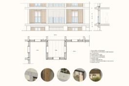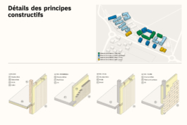 Le programme affirme l’exigence volontaire et forte de bâtiments au bilan carbone exemplaire, évolutifs, pérennes, aux matériaux biosourcés, prêt à suivre les évolutions du climat d’ici à 2050. A cela s’ajoute la demande de rapidité et de qualité d’exécution qui font définitivement privilégier la préfabrication. L’expression du juste usage constructif de chaque matériau est recherchée. Les bâtiments ordonnancent des matières et matériaux utilisés justement, selon leur mise en œuvre singulière et qui expriment toute leur singularité : pierre, brique, bois, métal. Ils sont sobres, architectoniques, épais, pérennes et élégants. Le bâtiment C1 constitue avec d’autres bâtiments du quartier développé sur le talus, un ilot sur cour. Il marque un alignement sur la venelle haute, et s’ouvre sur la cour qu’il contribue à dessiner. Il restitue les principes proposés pour les bâtiments C5 et C6 en adoptant le principe de failles, de paliers et halls traversant, d’escaliers à l’air libre.